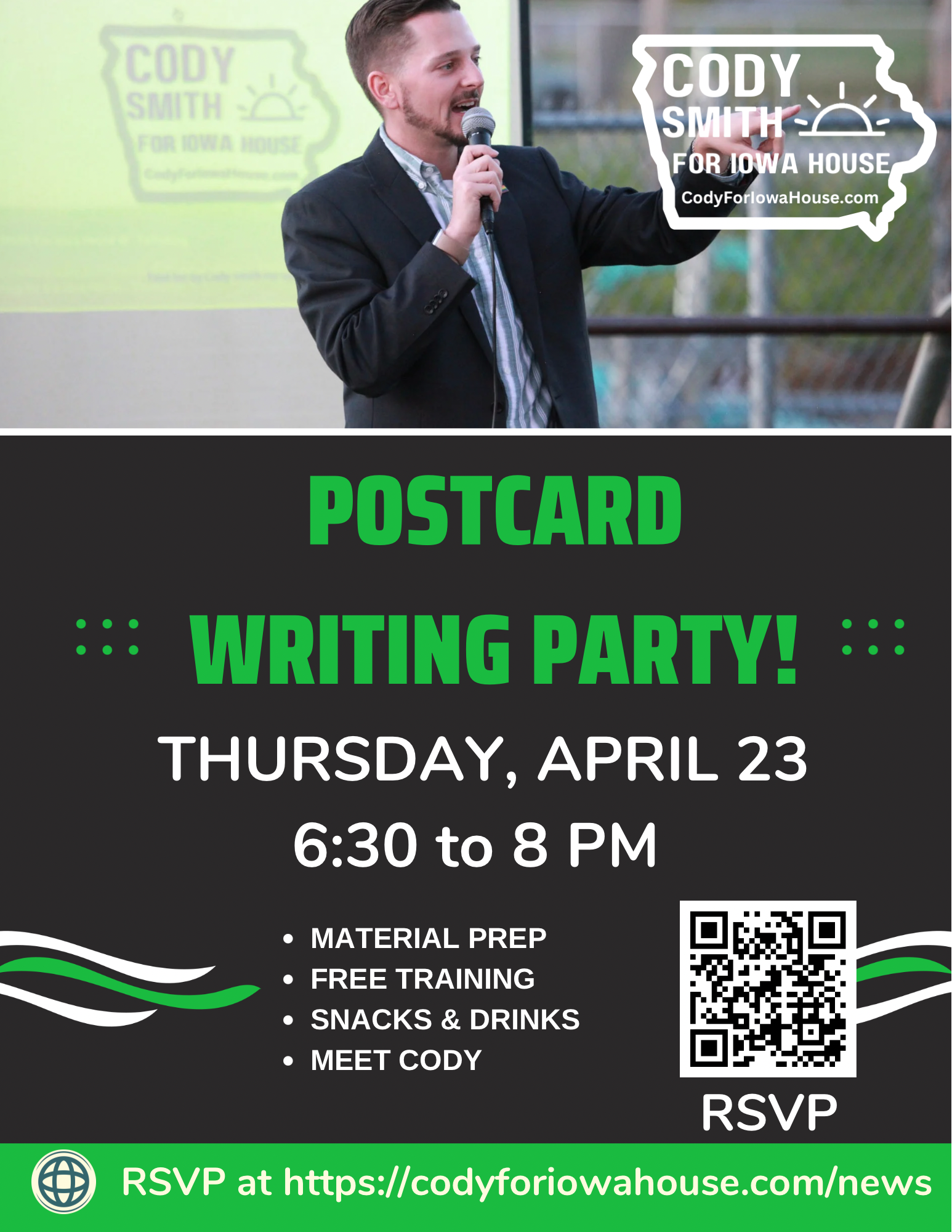 Join us on Thursday, April 23rd for a Postcard Writing Party in support of Cody’s campaign for the Iowa House. RSVP below.